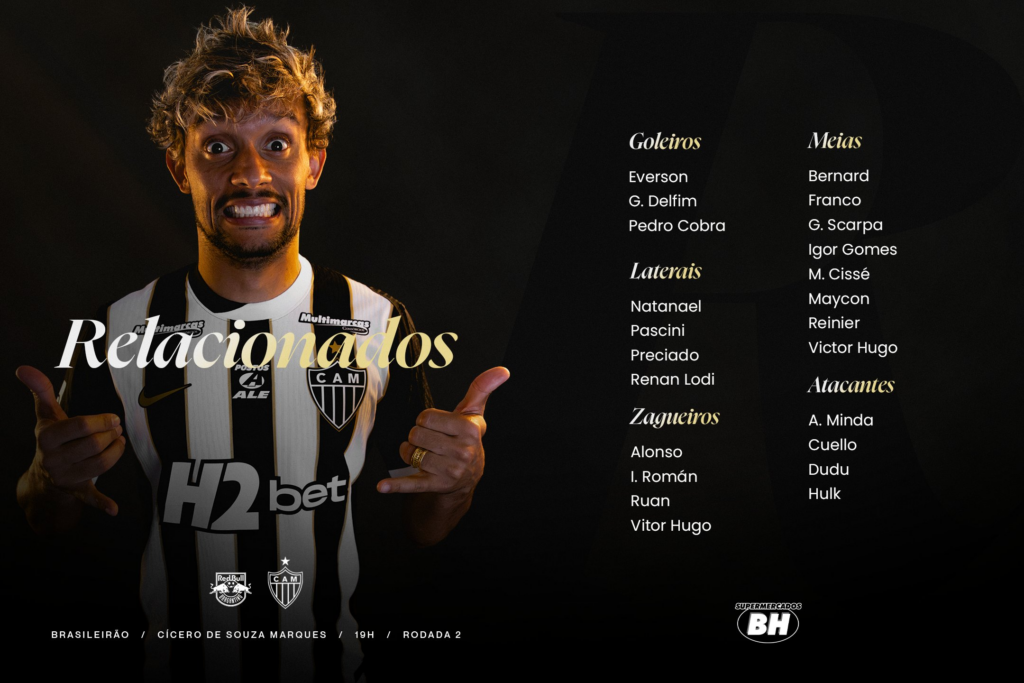 O Atlético divulgou, na tarde desta terça-feira (03), a lista de jogadores relacionados para a partida contra o Red Bull Bragantino, válida pela segunda rodada do Campeonato Brasileiro. O confronto acontece nesta quarta-feira (04), às 19h, no Estádio Cícero de Souza Marques, em Bragança Paulista.